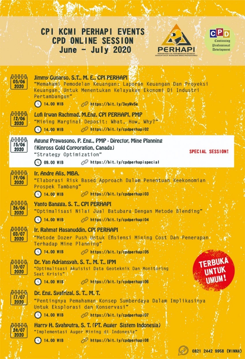 Sebagai upaya pencegahan dari penyebaran wabah Virus Corona (Covid-19) dengan melakukan social distancing, dengan ini kami Komite CPI PERHAPI akan mengubah tata cara pelaksanaan kegiatan CPD dari yang sebelumnya temu muka langsung (off-line) menjadi on-line, sampai kondisi dinilai cukup aman untuk kembali ke tata cara CPD sebelumnya. Kegiatan CPD Online kali ini melalui aplikasi Zoom.